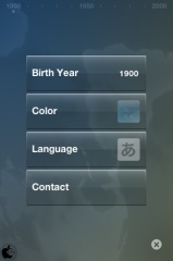 設定画面では、自分の誕生年を設定したり、背景カラー、言語の切換えなどを行なう事ができます。