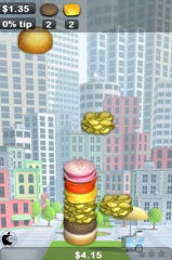 iPhone/iPod touch本体を揺らして、バンズの下(ヒール)を操作し、上から落ちてくる食材をキャッチして、どんどん積み上げてゆきます。