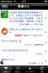 このアプリの特長は、ブラウザ内で表示させたエントリーに対して、画面上にある関連スレボタンをタップすると、さらに関連すると思われるエントリーを一覧表示してくれるところだと思います。