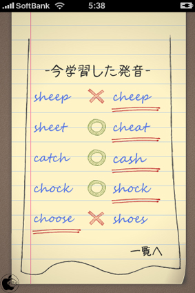 すると、発音が流れるので、聞き取った発音が、画面上に表示されているどちらなのかを決めて指でタップします。