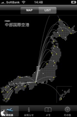 タッチ式日本地図上で出発空港をポイントして、到着空港までドラッグする1動作で、航路を選ぶことが可能で、リスト形式で空港を選択し、航路を選ぶことも出来ます。