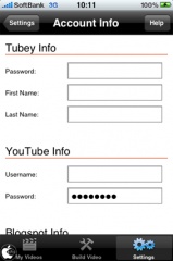 まず、最初にアプリから、Tubeyのアカウントを作成します。アカウントが作成終わったら、次に、画面下のSettingをタップし、Account Info>で、YouTube、Blogspot(BLOGGER)、Facebookのアカウントを入力します。(持っているアカウントだけで構いません)