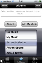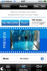 次に、バックグラウンドミュージックを当てます(無しも可能です)バックグラウンドミュージックは、iPodライブラリからも選択出来ますが、MP3ファイルフォーマットでないと選択することは出来ません。ただ、このアプリは著作権フリーのサウンドライブラリが用意されていて、その中から好きなサウンドを使う事も出来ます。