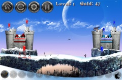 プレイヤーは右の青い城で、そのお城の上にある弓矢を引いて、赤い城から攻めてくる敵兵を倒していくディフェンスゲームアプリです。