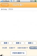 その他>マイ日記から日記を投稿することができ、写真のアップロードや、公開レベル設定なども行なうことが出来るようになっています。
