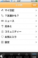 その他をタップすると、マイ日記、足あと、コミュニティー、設定などの表示をすることが出来ます。