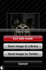 編集が終了したら、画面左下のアクションアイコンをタップすると、写真ライブラリーに保存したり、Twitterに投稿したり出来るようになっています。