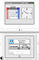 アプリを起動して、電源ボタンを押して電源を入れ、画面下をダブルタップすると、2画面表示され、画面上にカレンダーと時計、下にピクトチャットと、ニンテンドーDSiウェアの疑似コネクション画面が表示されます。