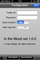 myb designが、iPhone/iPod touch用Twitter曲投稿アプリ「In the Mood」を、App Storeにて無料配付を開始していたので試してみました。