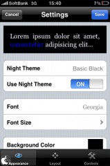設定アイコンをタップすると、夜テーマを変えたり、フォントや文字サイズ、背景色などをカスタマイズすることも出来ます。