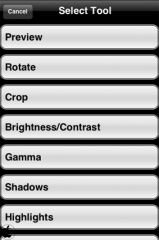 画面右上の編集アイコンをタップすると、編集項目として、Rotate(回転)、Crop(切抜き)、Brightness/Contrast(明るさ/コントラスト)、Gamma(ガンマ)、Shadows(シャドウ)、Highlights(ハイライト)、Levels(レベル)、Hue/Saturation/Lightness(色相/彩度/明度)、Color Balance(カラーバランス)、Sharpen(シャープネス)、Denoise(ノイズ低減)が表示されます