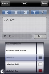 画面下のテキストアイコンをタップすると、文字入力画面が表示され、好きなメッセージを入力し、フォントデザインを選んだりする事ができます。