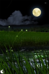 アプリを起動すると、月夜の草が生い茂る湖畔が表示され、蛍がゆっくりと飛び回ります。