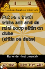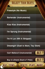 最初に、画面下のBEATSをタップし、インストゥルメンタルをダウンロードします。用意されているインストゥルメンタルは、Bartender、Kiss Kiss(Chris Brown)、I'm Sprung、I'm N Luv (Wit a Stripper)、Dreamgirl (Duet with Akon, Tay Dizm)(Tay Dizm)の5曲が無料で利用出来ます。
