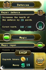 1ステージ終了する毎にショップが開き、獲得したゴールドを使って壁を修復したり、魔法力や攻撃力を強化したりできます。