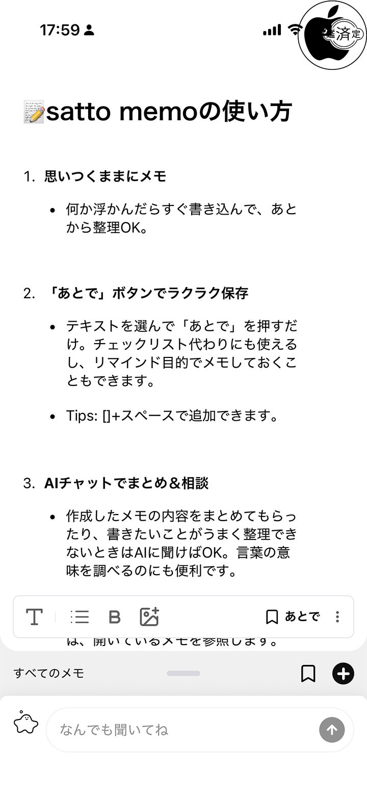 satto memo は通常のメモの自由度に、AIチャットのサポートを掛け合わせた新しいメモアプリです。