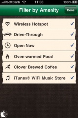 Storesの画面の左上にあるロートアイコンをタップすると、ホットスポットが利用可能なお店や、ドライブスルーがあるお店といった絞り込み設定をかけることが出来ます。