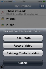 また、写真ライブラリーにある写真や動画ファイルをアップロードする事も出来るようになっていて、iPhone 3GSのカメラを利用して、写真や動画を直接アップロードすることも出来るようになっています。