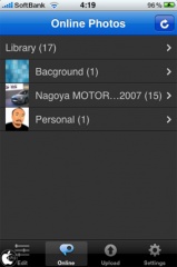 Photoshop.comのアカウントを設定し、Onlineをタップすると、オンライン上のライブラリーが表示され、また、写真をアップロードすることも出来ます。