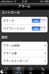 まず最初に、アラームの設定で、アラーム時刻、アラーム音、アラームメッセージなどを設定します。