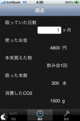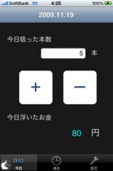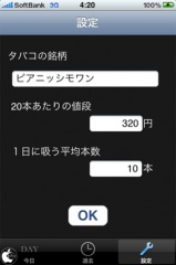 最初に設定で、タバコの銘柄、20本あたりの値段(一般的には一箱)、1日に吸う平均本数を入力して保存します。