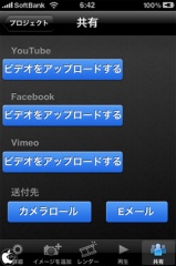 共有タブをタップすると、作成した動画を、YouTube、Facebook、Vimeoに投稿したり、メール添付したりすることが出来ます。