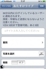メニューの右から2番目のおたすけライブタブをタップすると、30分以内にログインしているユーザーに対して質問を通知して回答を得る機能が装備されています。