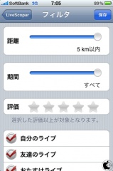 フィルタ設定で、ライブを取得表示する場合、現在地からの距離範囲、期間、評価などを設定することができ、表示されるライブの種別設定も行なう事が出来ます。