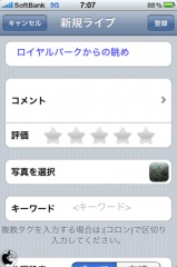 タイトル、コメント、評価、キーワードなどを入力し、写真や公開レベル設定などを行なって登録ボタンをタップすると投稿が完了します。