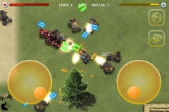 操作方法は、左のサークルが移動、右のサークルが、砲台の向きとシューティングを兼ねたコントローラーとなっています。