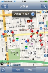 検索したいキーワードをタップすると、Googleマップが表示され、検索結果がピンで表示されます。