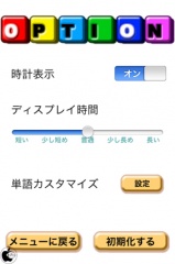 OPTIONをタップすると、時計表示のオン/オフ、表示切替時間間隔、単語のカスタマイズなどを行なう事が出来るようになっています。