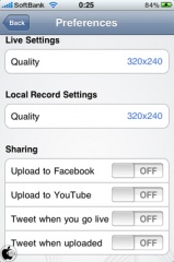 OPTIONSをタップすると、ストリーミング解像度(320x240、176x144)、Facebook、YouTube、Twitterとの連携設定なども行なう事が出来ます。