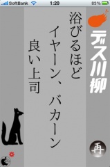 2009年12月15日(火) iPhone App Store#iPhone_3G#iPod_touch#デス川柳 ランダム川柳アプリ「デス川柳」を試す ※本サイトは、アフィリエイト広告および広告による収益を得て運営しています。購入により売上の一部が本サイトに還元されることがあります。 デス川柳 エレクトロドリームが、iPhone/iPod touch用偶然川柳アプリ「デス川柳」を、App Storeにて販売を開始していたので試してみました。 上五句92、中七句166、下五句119の中らランダムに組み合わせて、デス川柳を作成してくれるアプリです。 アプリを起動すると、デス川柳が表示され、本体を振るか画面をタップすると次のデス川柳が表示されます。 偶然に作成されるデス川柳を読むと、時おりとんでもない川柳で笑えます。 ↓の評価ボタンを押してランキングをチェック!