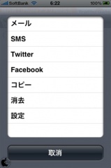 追加パレットの右端にあるアクションボタンをタップすると、メールやSMSへの転載のほかに、TwitterやFacebookに投稿することも出来るようになっています。