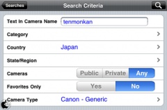 国を日本に、カメラタイプをCanonに設定して、キーワードにtenmonkanと入力して、右上の検索ボタンをタップします。