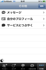 その他タブでは、画面下のタブバーに表示されていない機能タブや、自分のプロフィール情報を見る事が出来ます。