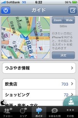 このアプリの最大の特徴は、このガイドタブで、現在地情報を元に、飲食店やショッピング情報を表示し、そのお店に関するツイートや、投稿などを行うことが出来る点です。