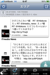 エリアタブでは、現在地から半径100m、500m、2km圏内のツイートを絞り込みして見る事が出来ます。