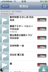 現在地情報を元に、飲食店情報を表示してみたところ、現在地から近い距離順にお店情報が表示されました。