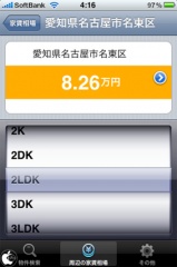 周辺の家賃相場をタップすると、現在地情報を元に、間取りによての相場を見る事が出来ます。