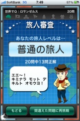 出題された20問を答え終わると、旅人審査結果が表示されます。