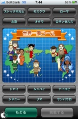 クイズには、世界一周コース、おまかせコース、選択コースが用意されていて、世界一周コースでは、世界12カ所〜ストックホルム、モスクワ、ローマ、北京、オタワ、ロサンゼルス、ドバイ、ムンバイ、ナイロビ、シドニー、リマ、サンパウロ〜の各地の人物から出題される20問の問題に答えてスタンプを集め、世界一周を目指します。
