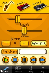 Mainタブには、画面上に楽器の種類を選択出来るストリップがあり、そこで楽器を選んで、マイクを使って声を吹き込むと、その声に楽器のエフェクトがかけられ、楽器を演奏することが出来ます。