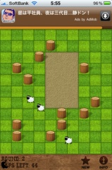 切り株で遮り、動き回る羊を牧場に追い込むゲームアプリです。