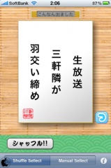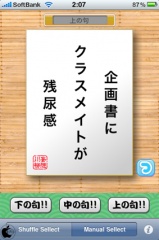 プリセットされた上/中/下の句それぞれ100種類からランダムに選ばれて、意味不明な川柳を作成するアプリです。
