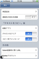 設定をタップすると、単語の追加、テキストをコピーボタンをタップした時に起動するアプリケーションの指定などを行う事が出来ます。