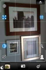 左側の地球アイコンは、GEOタグを付加するかどうかを選択する機能ボタンで、その下が、画面全体をシャッターにする機能ボタン、スピーカーアイコンが設定音量調整ボタン、タイマー撮影をするボタンが配置されています。