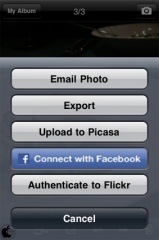 写真をフル表示した場合、左下のアクションボタンをタップすると、メール添付したり、通常の写真ライブラリー書き出したりでき、また、Picasa、Facebook、Flickrに投稿したりすることも出来るようになっています。