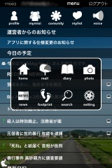 自分のメール、マイミク情報、参加コミュニティ、日記、フォトアルバムなどを閲覧出来ます。